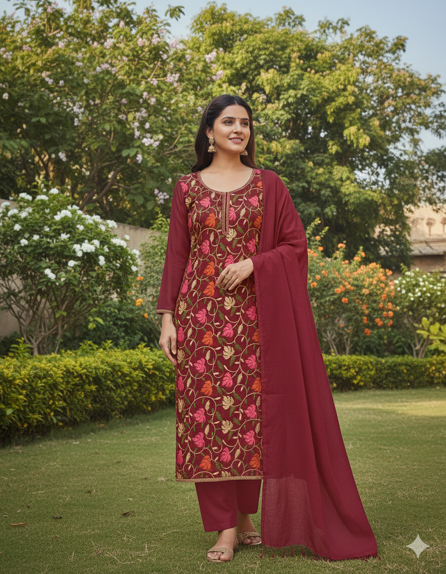 *Allover cottswool suit with kashmiri chinar jaal embroidery on front*(approx 4.25 mts)